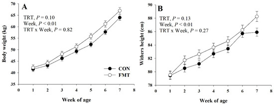 Body weight (A) and withers height (B) from birth (week 1 of age) to weaning (7 weeks of age) of Holstein dairy calves raised under a conventional nutritional program (CON) or subjected to fecal microbiota transplantation (FMT). The p-values for main effects of treatment (TRT) and week, and their interaction (TRT × Week) are shown in each plot. Values are means with standard errors represented by vertical bars.