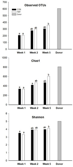 A total of 3267 species-level OTUs were identified. Analysis of alpha indices indicated a significant increase in diversity between week 1 and 5 for the FMT calves (Figure 3). No clear separation of groups into clusters by PCoA was observed (Figure S2), indicating that samples had overlapping bacterial compositions across different groups. Twelve abundant OTUs were found to vary across calf samples (Table S3; p < 0.05), but we were unable to resolve differentially represented groups using pairwise comparisons. Among these, OTUs Bt-01163 and Bt-01238 had a numerically lower abundance in the FMT group in comparison to the CON at week 5, while Bt-01193 and Bt-01356 abundance were numerically higher in FMT calves than CON at week 5. Based on their nucleotide sequence identity to their respective closest valid relatives (82.23–92.92%), at least nine of the main OTUs were likely to correspond to currently uncharacterized bacterial species (Table S3).