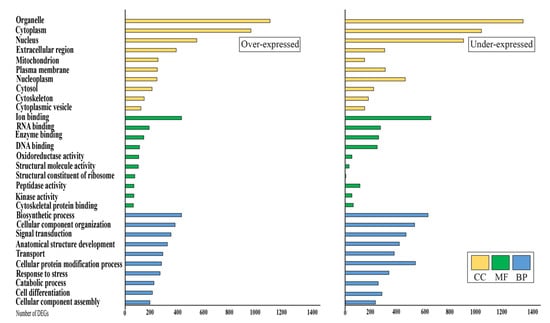 Finally, considering CC, overall 24 GO terms were retrieved, amongst these terms, genes mostly belonged to “organelle” (GO:0043226, represented by 1113 OE and 1352 UE DEGs), and “cytoplasm” (GO:0005737 with 966 and 1036 respectively activated and repressed transcripts) (Figure 2).