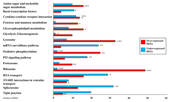 Differentially expressed gene distribution for enriched KEGG. Red bars represent over expressed genes and blue bars stand for under expressed transcripts. * = p-Value ≤ 0.05; ** = p-Value ≤ 0.01; *** = p-Value ≤ 0.001; DEGs = differentially expressed genes.