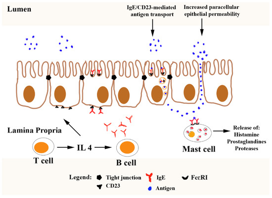 The increased transepithelial transport of allergen mediated by IgE/CD23. IL-4 synthesis by T cells induces isotype switch and production of IgE by B cells. IL-4 is secreted into the serum and intestinal lumen and acts on enterocytes to upregulate the expression of the low-affinity IgE receptor, CD23 (FcεRII). Further, IgE bound to high-affinity receptor FcεRI on the mast cell surface and CD23 and consequently, the large amount of antigen can cross the epithelial barrier and bypass the degradation machinery. Adopted and modified from Yu [91].