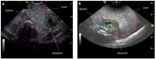 The change in body condition between health examinations offered a unique opportunity to evaluate the effect of body condition on reproductive function. Body condition was subjectively evaluated based on the appearance of the celomic fill and ultrasound characteristics [14]. Then a body condition score was assigned on a scale of 1 to 5 (1 being emaciated, 3 normal and 5 being morbidly obese) by the same researcher (N.D.M.) to eliminate inter-assessor variability. Coelomic ultrasound was performed transcutaneously in dorsal recumbency using a GE LogiqE with a 5–8 MHz curvilinear and 5–10 MHz linear transducer (General Electric Company, Boston, MA, USA) [14]. An animal of a low body condition had an ultrasound characterization that showed a small liver that spanned <50% of the coelom, had the spleen and liver thickness similar to each other and the liver and spleen were isoechogenic. Conversely, a good body conditioned animal had a liver >50% of the coelomic length, a liver that was thicker than the spleen as well as hyperechoic to the spleen (Figure 1). Average depth of the spleen in good condition was at 4 cm and <2 cm in low condition.