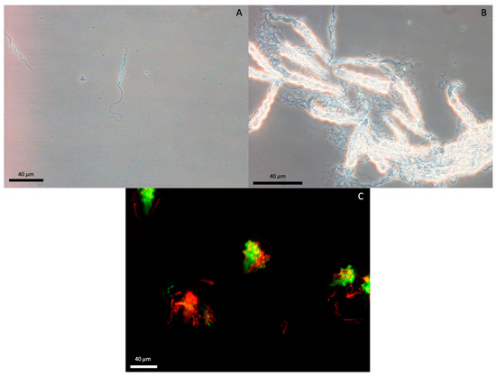 Semen and sperm characteristics are shown in Table 1. The spermatozoa were filiform, with a helical head (38.3 ± 0.18 μm) comprised ~4.3 gyres (6.1 if midpiece is included), midpiece (14.5 ± 0.16 μm) and flagellum (64.1 ± 0.44 μm; Figure 2A). Ejaculates consisted of a mixture of free sperm distributed throughout the accessory fluid, and spermatozeugmata (Figure 2B) characterized by aligned sperm bundles [35].