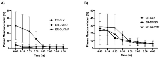 Plasma membrane integrity ( ± SEM) of frozen-thawed southern stingray (Hypanus americanus) sperm (March n = 1, June n = 3) in using (A) conventional and (B) modified slow freeze methods. ER = Hank’s elasmobranch ringer solution; GLY = glycerol; DMSO = dimethyl sulfoxide; MF = N-methylformamide.
