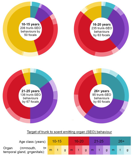 Donut charts summarising all observed trunk-to-SEO behaviours directed by focal elephants of different ages. Inner rings indicate age class targeted for behaviour, and outer rings the target organ.