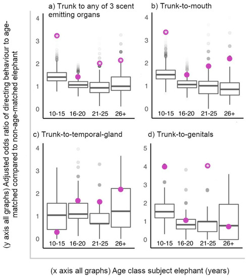 Observed adjusted odds ratios of elephants directing a trunk-to-SEO behaviour to an age-matched elephant relative to non-age-matched elephant (purple circles), plotted against random permuted adjusted odds ratios of directing a trunk-to-SEO behaviour to an age-matched relative to non-age-matched elephant (boxplots with median, interquartile range, minimum and maximum values). Significant permutation-based adjusted odds ratios indicated with “*”. (a) Considering all target organs together, all ages were more likely to target age-matched elephants relative to non-age-matched elephants with trunk-to-SEO behaviours than expected by chance, except older adolescents (16–20 years), who targeted age-matched elephants as expected by random chance (permutation-based observed adjusted odds ratio of targeting age-matched relative to non-age-matched elephant with trunk-to-SEO behaviour: 10–15 years = 3.268, p < 0.001; 16–20 years = 1.454, p = 0.085; 21–25 years = 2.056, p = 0.014; 26+ years = 2.185, p = 0.048 (Supplementary Table S16 for randomised 95% confidence intervals)). (c) All age classes directed trunk-to-temporal-gland behaviours to age-matched elephants as expected by random chance, (b) 10–15-year-olds directed trunk-to-mouth behaviours to age-matched elephants more than expected by random chance, and (d) 21–25-year-olds directed trunk-to-genitals behaviours to age-matched males more than expected by random chance (Supplementary Table S16 for observed adjusted odds ratios, 95% confidence intervals and p values for each age class and target organ).