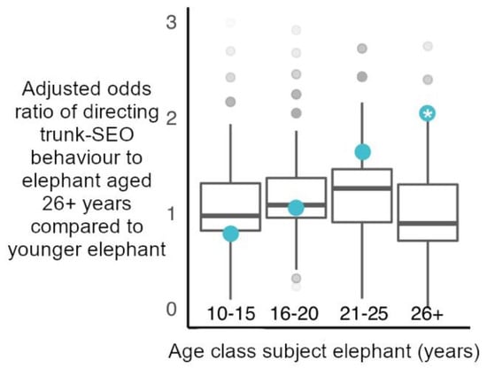 Observed adjusted odds ratios of elephants directing a trunk-to-SEO behaviour to a mature bull (26+ years) relative to younger elephant (blue circles), plotted against random permuted adjusted odds ratios of directing a trunk-to-SEO behaviour to a mature bull relative to younger elephant (boxplots with median, interquartile range, minimum and maximum values). Only elephants aged 26+ years directed these behaviours to fellow mature bulls more than expected by chance (Significant permutation-based adjusted odds ratio (*): 2.077, p = 0.042 (Supplementary Table S18 for observed adjusted odds ratios, 95% confidence intervals and p values for all ages)).