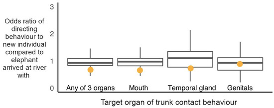 Considering the organs targeted with trunk-to-SEO behaviours individually, whether an elephant arrived at the river in a group with the subject elephant, or whether the subject was exposed to an elephant as a new potential interactor at the river did not predict the likelihood of the subject directing the trunk to a target’s mouth (permutation-based likelihood ratio test of GLMM, χ2 (1) = 0.120, p = 0.116; Figure 5), temporal glands (permutation-based likelihood ratio test of GLMM, χ2 (1) = 0.535, p = 0.525, Figure 5) or genitals (permutation-based likelihood ratio test of GLMM, χ2 (1) = 0.868, p = 0.843, Figure 5).