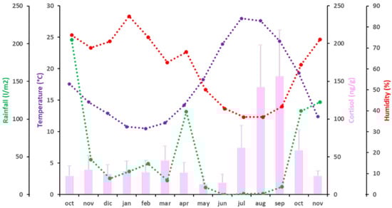 The mean values of C fecal concentration ranged from 13.97 ± 10.53 ng/g dry fecal material, the lowest concentration, observed in May 2016, to 156.67 ± 60.89 ng/g dry fecal material, the highest concentration, in September 2016 (Figure 3). From October 2015 to June 2016, during winter and spring, fecal C levels were below 50 ng/g dry fecal material. Then, C levels started to increase in early summer, to 62.04 ± 29.54 ng/g dry fecal material in July 2016 (p < 0.05; partial η2 = 0.857). An elevation of C levels above 100 ng/g dry fecal material was observed during August and September 2016, when C levels were around 150 ng/g (p < 0.05; partial η2 = 0.897). After this plateau, an important decrease in fecal C levels was observed, coinciding with the beginning of autumn in October 2016 (58.59 ± 27.08 ng/g dry fecal material) (p < 0.05; partial η2 = 0.895), and again below 50 ng/g dry fecal material in November 2016 (24.70 ± 7.2 ng/g dry fecal material) (p < 0.05; partial η2 = 0.67). Fecal C concentrations were independent of all climatic variables studied (T°, H, and rainfall) (Figure 3 and Table 4).