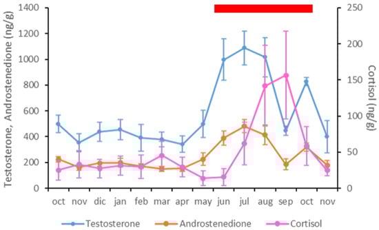 Circannual periodicity in circulating steroid hormones has been found in many mammals including deer, humans, squirrels and horses [9,10,11,12]. However, little is known about the annual secretion of cortisol (C), androstenedione (A4) and testosterone (T) in male Asian elephants as measured by their fecal concentrations.