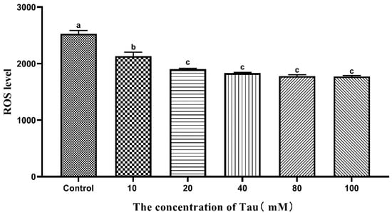 Effects of different concentrations of Tau stored at room temperature on the production of ROS in the sperm on the fifth day (n = 10). Note: Letter difference means significant difference (p ≤ 0.05), but the same letter means no significant difference (p > 0.05).