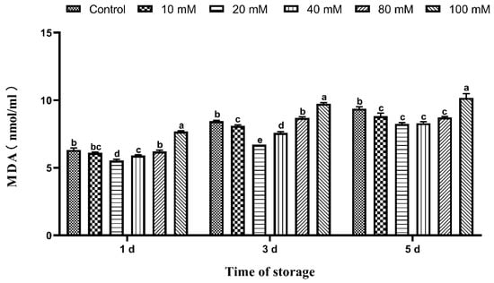 The effects of different concentrations of Tau on Hu sheep semen MDA content during liquid storage at 15 °C are shown in Figure 2. The MDA content of semen in the 20 and 40 mM groups was significantly lower (p ≤ 0.05) than that of the control group on the 1st day. The MDA content of the 100 mM group was significantly higher (p ≤ 0.05) than that of the control group on the 1st day. The MDA content of the 10, 20, and 40 mM group was significantly lower (p ≤ 0.05) than that of the control group on the 3rd day. The MDA content of the 100 mM group was significantly higher (p ≤ 0.05) than that of the control group on the 3rd day. The MDA content of the 10, 20, 40, and 80 mM group was significantly lower (p ≤ 0.05) than that of the control group on the 5th day. The MDA content of the 100 mM group was significantly higher (p ≤ 0.05) than that of the control group on the 5th day.