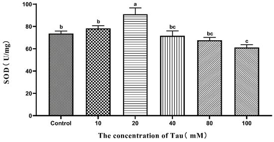 Effects of different concentrations of Tau stored at room temperature on SOD activity of the sperm on the fifth day (n = 10). Note: Letter difference means significant difference (p ≤ 0.05), but the same letter means no significant difference (p > 0.05).