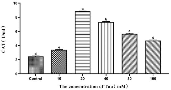 Effects of different concentrations of Tau stored at room temperature on CAT activity in the semen on the fifth day (n = 10). Note: Letter difference means significant difference (p ≤ 0.05), but the same letter means no significant difference (p > 0.05).