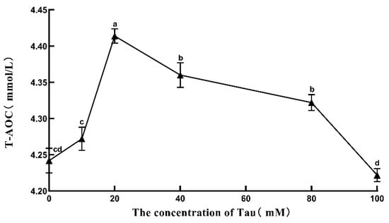 Effects of different concentrations of Tau stored at room temperature on T-AOC in the semen on the fifth day (n = 10). Note: Letter difference means significant difference (p ≤ 0.05), but the same letter means no significant difference (p > 0.05).