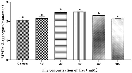Effects of different concentrations of Tau stored at room temperature on MMP of the sperm on the fifth day (n = 10). Note: Letter difference means significant difference (p ≤ 0.05), but the same letter means no significant difference (p > 0.05).
