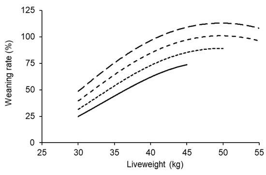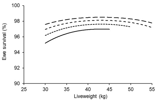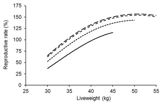 Heavier ewe lambs at the start of breeding weaned more offspring than lighter ewes due largely to their higher reproductive rate rather than the better survival of their offspring. The effect of liveweight at the start of breeding on reproductive rate was curvilinear, so that if ewe lambs achieved 45 kg at the start of breeding their reproductive rate was within 5% of the maximum achieved at heavier liveweights. Curvilinearity of this response to liveweight at breeding has also been reported for other flocks of non-Merino ewe lambs [15,23], although the critical weight beyond which the gains in reproductive rate become marginal varies between 45 and 50 kg. By contrast, in Merino ewe lambs responses are mostly linear at least up to 50 to 55 kg [10,11,12,14,15]. In our study, the reproductive rate increased by about 4.6% per kg between 35 and 45 kg, which is similar or slightly greater than other studies using Merino ewe lambs [10,11,14,15] and more than double that reported for maternal composite, Romney and Coopworth ewe lambs in New Zealand [23]. This variation in the response is presumably due to differences between experimental flocks in factors such as breed, genetics, mature body size and nutrition during mating. Therefore, the principal is clear that when bred early, managing maternal composite ewe lambs to be as heavy as realistically feasible will improve their reproductive rate. However, in practice, the overall target liveweight at breeding for individual flocks and the cost-effectiveness of providing additional supplementary feed to certain animals within each flock pre-breeding will vary for specific management settings.