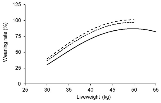 There was also a significant effect of the ewe lambs’ own birth type on the weaning rate response to liveweight (p < 0.001; Figure 2). At the same liveweight and age at breeding, weaning rate was significantly higher for ewe lambs that were born as twins or triplets compared to those born as singles.