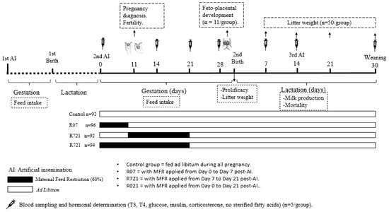 What we can introduce about the application of MFR is largely based upon our previous experimental studies [14,15], in which we have described the metabolic consequences observed in mothers and offspring subjected to a 60% MFR during three weeks of pregnancy (from day 0 to 21). This MFR led to a compensatory feed intake during the last week of pregnancy that offset the effects in the live body weight (LBW) and body reserves of the dams at parturition and the fetal body weight and phenotype at day 28 of pregnancy. These studies on MFR applied during three weeks of pregnancy have been limited to specific comparisons of the metabolic profiles of mothers and fetuses at a particular moment of gestation (day 28).