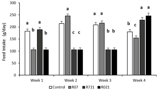 As expected, whole feed intake during pregnancy was different between groups (p < 0.0001). The Control and R07 groups consumed 5854 ± 124.3 g and 5529 ± 109 g, respectively, followed by R721 does (4518 ± 112 g) and the R021 group (4007 ± 106.3 g). The weekly evolution of daily feed intake is shown in Figure 2. Interestingly, the week after MFR, we observed that all groups increased their voluntary feed intake, surpassing the control group, like group R07 during the second week, and groups R721 and R021 during the fourth week of pregnancy.