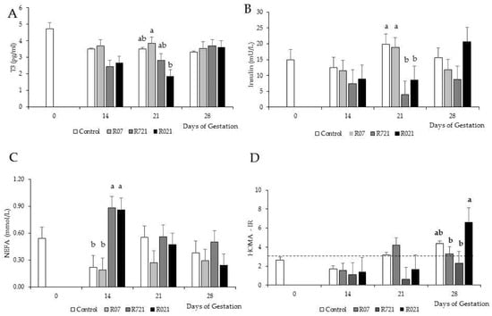 Effect of Maternal Feed Restriction and Time on (A) plasma triiodothyronine (T3), (B) insulin, (C) NEFA concentrations and (D) HOMA-IR during pregnancy of rabbits fed ad libitum (Control), restricted to 60% one week from day 0 to 7 (R07), two weeks from day 7 to 21 (R721) and three weeks from day 0 to 21 (R021) of gestation. (a–c): different letters indicate differences between experimental groups on each day of pregnancy (p < 0.05). Each bar on day 14, 21 and 28 shows the mean of five does, and on day 0 is the mean of 10 does. The dashed line in (D) represents the value above which HOMA-IR indicates the presence of insulin resistance.