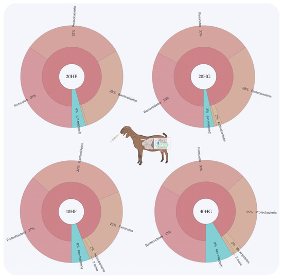 Relative abundance of the most abundant phyla in rumen fluid of goats fed diets (20HF, 20HG, 40HF, and 40HG) with different levels of Schizochytrium spp. (20 g and 40 g/goat/day) and two different forage to concentrate ratios (60:40 and 40:60) throughout the experimental period (21 and 42 experimental days) illustrated using Krona software. Additional statistics are available in Table S3.