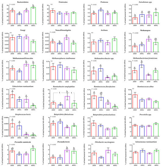 Average changes of target microorganisms in the rumen liquid of goats fed diets (20HF, 20HG, 40HF, and 40HG) with different levels of Schizochytrium spp. (20 g and 40 g/goat/day) and two different forage to concentrate ratios (60:40 and 40:60) throughout the experimental period (21 and 42 experimental days) illustrated in column bars (±Standard Error of Means) as a proportion of total rumen bacterial 16S rDNA. Bars with different superscript (a–c) between dietary treatments differ significantly (p ≤ 0.05) while t is referred to p-value < 0.10, according to the Analysis of Variance (ANOVA) using a general linear model for repeated measures and Post hoc analysis was performed when appropriate using Tukey’s multiple range test. Additional statistics investigating the interaction of microalgae level, forage to concentrate ratio, and the sampling time effect are available in Tables S4 and S5.