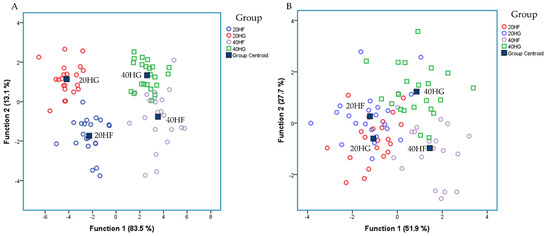 Discriminant analyses were also performed (variables were entered independent together) on rumen fluid fatty acids and the abundance of selected rumen microorganisms by qPCR pooled data to establish those variables capable of distinguishing and classifying samples amongst the four dietary groups (20HF, 20HG, 40HF, and 40HG). Wilk’s lambda (λ) criterion was used for assessing discriminant functions [45]. Twenty and twenty-four variables for rumen fluid fatty acid profile and the abundance of selected rumen microorganisms by qPCR were entered to create two models to distinguish the eighty-eight samples of each case (4 groups × 11 goats/group × 2 sampling time).