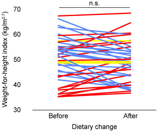 Effect of dietary change on weight-for-height index (WHI) in adult female long-tailed macaques. Each line represents an individual (n = 44). Blue lines represent a decrease, while red lines indicate an increase and yellow lines represent no change. n.s. means non-significant (p ≥ 0.05).