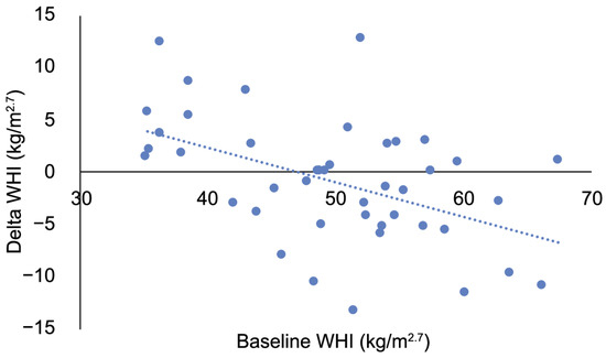 Delta weight-for-height index (WHI) plotted against the baseline WHI in adult female long-tailed macaques that were subjected to a minor dietary change.