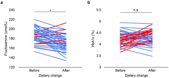 Effect of dietary change on fructosamine (a) and HbA1c levels (b) in adult female long-tailed macaques. Each line represents an individual (n = 44). Blue lines represent a decrease, while red lines indicate an increase and yellow lines represent no change. * means statistically significant difference, p < 0.05; n.s. means non-significant (p ≥ 0.05).
