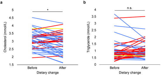 Effect of dietary change on cholesterol (a) and triglyceride levels (b) in adult female long-tailed macaques. Each line represents an individual (n = 44). Blue lines represent a decrease, while red lines indicate an increase and yellow lines represent no change. * means statistically significant difference, p < 0.05; n.s. means non-significant (p ≥ 0.05).