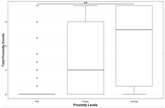 Boxplot representing all observations in the three types of proximity, where the boxes represent the lower and upper quartiles, whiskers represent the minimum and maximum observations, and horizonal line represents the median, with significant codes set as: ** 0.01.