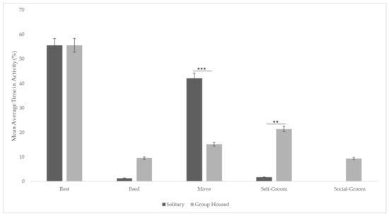 There was a statistically significant difference between activities in different periods (F (1,1240) = 7.059; p = 0.007). Post hoc tests showed that they spent significantly less time moving (p < 0.001) and more time self-grooming (p = 0.002) when under the group condition, but there were no significant changes in resting (p = 0.631) or feeding time (p = 0.973) between the two housing conditions. Social grooming could not be compared between the two housing conditions, but when housed with conspecifics, female pygmy slow lorises spent an average of 21.3% self-grooming and 9.36% of the time grooming each other (Figure 2).