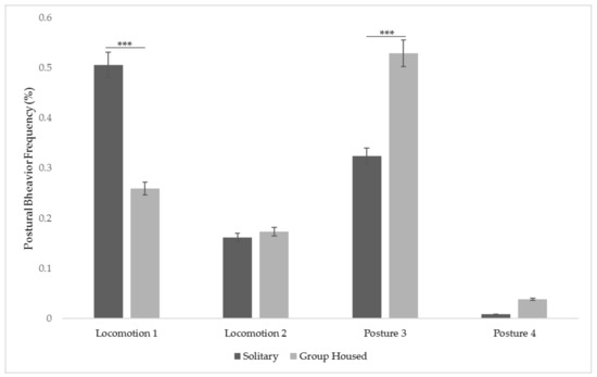 There were no significant differences between postural behaviors under different housing conditions (solitary vs. social housing) (F (3,3020) = 0.02; p = 0.88). Post hoc tests showed that there was a significant decrease in Locomotion/Posture 1(p < 0.001) and a significant increase in Locomotion/Posture 3 (p < 0.001), but no significant differences in Locomotion/Posture 2 (p = 0.89) or in Locomotion/Posture 4 (p = 0.98) (Figure 3).