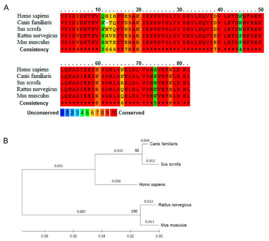 Comparison of nesfatin-1 sequence across (Homo sapiens), dog (Canis familiaris), pig (Sus scrofa), rat (Rattus norvegicus), and mouse (Mus musculus) shows a high homology at the amino acid level. (A) Nesfatin-1 amino acid sequence in human (UniProtKB: P80303), dog (UniProtKB: P80303), pig (UniProtKB: A0A5G2RI19), rat (UniProtKB: Q9JI85), and mouse (UniProtKB: P81117) were compared using the multiple sequence alignment program PRALINE [4] (https://www.ibi.vu.nl/programs/pralinewww, accessed on 13 December 2021). The scoring scheme works from 0 for the least conserved alignment position, up to 10 for the fully conserved alignment position (*). (B) Phylogenetic tree generated by the Maximum Likelihood method using the with Mega-X software (ver. 11.0.10) [5] based on amino acid sequences. The branch lengths reflect the degree of divergence of each sequence, numbers in bold on branches represent the bootstrap value.