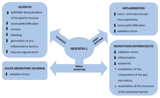 Another interesting property of peripheral nesfatin-1 is its beneficial effects during the course of several intestinal disorders. In the small intestine of neonatal rats with induced necrotizing enterocolitis (NEC), intraperitoneal injection of nesfatin-1 significantly reduced macroscopic and clinical scores and reversed the negative effect of oxidative stress by restoring and maintaining the balance between pro-oxidant and antioxidant mechanisms. Furthermore, the therapeutic anti-inflammatory and anti-apoptotic effects of nesfatin-1 observed in NEC-induced intestinal damage remained under the control of the afferent neurons and were linked to the protein’s ability to modulate the composition of the gut microbiota and the structure of the intestinal barrier [30]. It should be noted that previous research revealed an analogous role of nesfatin-1 as a factor balancing oxidative status in a rat small intestine model of acute mesenteric ischemia [31,32].