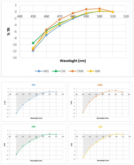 The absolute value of the integral (SUM) is defined as the area that is comprised between the curve and X-axis in the zone 450–510 nm. In agreement with the results presented in Figure 1 and Table 2, MG kids registered a greater area than TMR kids, which agrees with the results from other authors [33]. This appears to be the first study that compares the SUM and the %TR between 450 and 510 nm in the fat of kids fed natural milk (with different goat management systems) and a milk replacer.