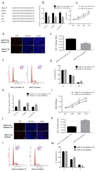 The effect of miR-22-3p on skeletal muscle proliferation of Hu Sheep. (a) Homology analysis of mature sequences of miR-22-3p in different species; (b) the relative expression of PCNA, CDK2 and cyclin D1 after overexpression of miR-22-3p; (c) the OD450 of all living cells after transfection of miR-22-3p mimics; (d,e) EdU cell proliferation assay (400×); proliferation rate of transfected miR-22-3p mimics; (f,g) cell cycle; ratio of skeletal muscle cells at different stages after overexpression of miR-22-3p; (h) the relative expression of PCNA, CDK2 and cyclin D1 after interference with miR-22-3p; (i) the OD450 of all living cells after transfection of miR-22-3p inhibitor; (j,k) EdU cell proliferation assay (400×); cell proliferation rate after transfection of miR-22-3p inhibitor; (l,m) cell cycle; ratio of skeletal muscle cells at different stages after interference with miR-22-3p. (** compared with the control group, p < 0.01).