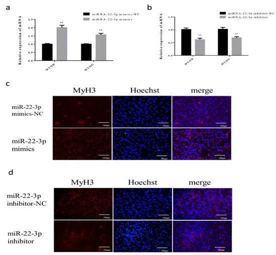 The effect of miR-22-3p on skeletal muscle differentiation of Hu Sheep (a) The relative expression of MyoD and MyoG after overexpression of miR-22-3p; (b) the relative expression of MyoD and MyoG after interference with miR-22-3p inhibitor; (c) after overexpression of miR-22-3p, the red fluorescence of MyH3 was detected; (d) the red fluorescence of MyH3 was detected after interfering with miR-22-3p inhibitor. (** compared with the control group, p < 0.01).