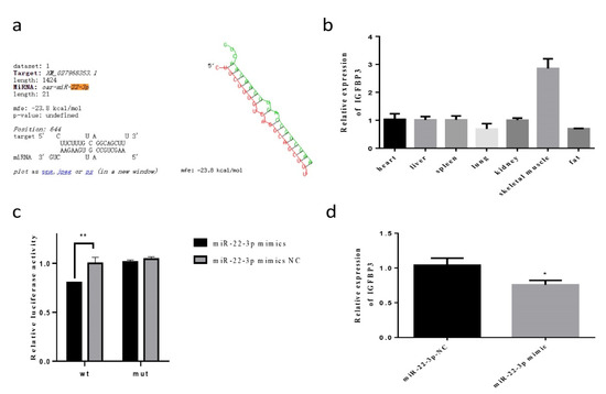 We used mirDIP and miRTargets software to predict the target genes of miR-22-3p. The result was confirmed by RNAhybrid (Figure 3a). We focused on IGFBP3 because the function of this gene in sheep skeletal muscle cells is unknown yet, and it is differentially expressed during skeletal muscle development (unpublished RNA-seq data). At the same time, the mirDIP bioinformatic software predicted IGFBP3 as target with a high score. The tissue expression profile showed that IGFBP3 had the highest expression in skeletal muscle cells (Figure 3b). The results of the dual luciferase reporter vector showed that the fluorescence activity is reduced (Figure 3c). After transfection of miR-22-3p mimics and NC, the expression of IGFBP3 was significantly reduced (p < 0.05) (Figure 3d).