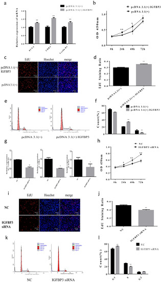 We constructed the overexpression vector of IGFBP3 and transfected it into skeletal muscle cells. The qPCR results showed that the expression of key genes CDK2, cyclin D1, and PCNA for cell proliferation increased significantly (p < 0.01) (Figure 4a). CCK-8 showed that the OD450 of the cells was significantly higher than that of the control group after transfection 24 h (p < 0.01) (Figure 4b). In addition, the number of EdU positive cells increased significantly (p <0.01) (Figure 4c,d). The results of flow cytometry showed that the number of cells in S phase was significantly higher than that of the control group (p < 0.01) (Figure 4e,f). Next, we interfered IGFBP3 mRNA with siRNA. The qPCR results showed that the expression level of cyclin D1 was extremely significantly reduced (p < 0.01), and the mRNA expression of CDK2 and PCNA was significantly reduced (p < 0.05) (Figure 4g). CCK-8 showed that the OD450 value of the interference group was significantly reduced after 48 h and 72 h compared with the control group (p < 0.01) (Figure 4h). EdU staining results showed that the number of positive cells was significantly reduced (p < 0.01) (Figure 4i,j). In addition, the results of flow cytometry showed that the number of cells in S phase was significantly lower than that of the control group (p <0.01) (Figure 4k,l). These results indicated that IGFBP3 could regulate proliferation of skeletal muscle cells.