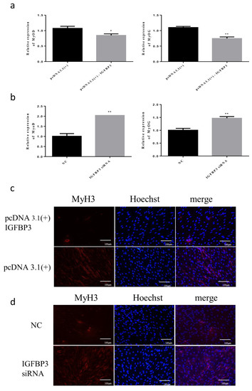 The effect of IGFBP3 on skeletal muscle differentiation of Hu Sheep. (a) The relative expression of MyoD and MyoG after overexpression of IGFBP3; (b) the relative expression of MyoD and MyoG after interference with IGFBP3; (c) after overexpression of IGFBP3, the red fluorescence of MyH3 was detected; (d) the red fluorescence of MyH3 was detected after interfering with IGFBP3. (* compared with the control group, p < 0.05, ** compared with the control group, p < 0.01).