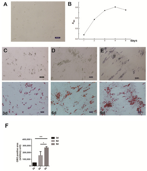 Isolation, proliferation and differentiation of pig intramuscular preadipocytes. (A) Purified intramuscular preadipocytes from pig skeletal muscle. (B) The proliferation dynamics of porcine intramuscular preadipocytes in culture. (C–E) The adipogenic differentiation of porcine intramuscular preadipocytes at 3, 6, and 9 days. The upper panels are bright view and the lower panels are Oil Red O staining. (Scale bars, 50 µm). (F) The quantitation of Oil Red O (ORO)-positive region for porcine intramuscular preadipocytes at 3, 6, and 9 days. Data are expressed as means + SEM. * indicated p < 0.05, *** indicated p < 0.001.