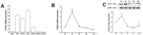 The ACSL4 gene encodes fatty acid-CoA ligase 4, an isozyme of the long-chain fatty-acid-coenzyme ligase family. It converts free long-chain fatty acids into fatty acyl-CoA esters, and thereby plays a key role in lipid biosynthesis and fatty acid degradation [10]. Five isoforms of ACSL have been identified in humans and rodents, and they perform individual functions in fatty acid metabolism. ACSL4 showed a marked preference for arachidonic and eicosapentaenoic acid as substrates and play important roles in metabolic regulation of cell proliferation, differentiation and migration [11]. Dysregulation of ACSL4 has been demonstrated to promote ferroptosis in different cell types [12,13], and cause diverse diseases and disorders, such as hepatocellular carcinoma [14], breast cancer [15], intellectual disability [16], and mental dysfunction [17]. However, the expression dynamics and regulatory function of ACSL4 in adipogenesis or lipogenesis have not been thoroughly investigated.