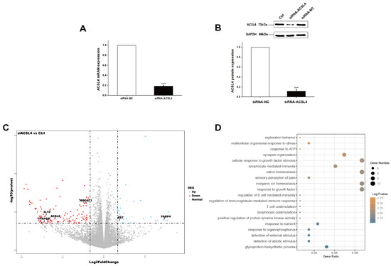 Next, we wondered whether the knockdown of ACSL4 gene in intramuscular preadipocytes cells affects the gene expression associated with fat deposition. We performed RNA-seq to measure the expression profiles of intramuscular preadipocyte cells transfected with siRNA-NC and siRNA-ACSL4. The RT-qPCR and Western blot showed that the knockdown efficiency could reach more than 70% and 80% for mRNA and protein levels, respectively (Figure 3A,B and Figure S1). Next, we performed transcriptome analysis in the ACSL4 knockdown cells and the control cells to discover the differentially expressed genes (DEG) and related pathways caused by the ACSL4 loss-of-function. A total of six RNA-seq libraries were constructed. The sequencing reads data and all the expressed genes are summarized in the supplementary information (Tables S2 and S3). Compared to the control, 134 genes were differentially expressed in the ACSL4 knockdown cells (Fold Change ≥ 2, p < 0.05). Among the DEGs, we identified that many adipogenesis-related genes were downregulated, including MOGAT1 [18], IL10 [19], TFAP2B [20], and ACSL6 [21], while several negative regulators of adipogenesis, such as FABP4 [22] and SST [23], were upregulated (Figure 3C). The KEGG pathway analysis of the DEGs shows that the majority of differentially expressed genes were enriched in signaling pathways that are important during adipogenesis, such as “response to ATP” and “cellular response to growth factor stimulus” [24]. Interestingly, several cellular development and differentiation pathways, such as “cell exploration behavior” and “multicellular organismal response to stress” were also enriched in the KEGG analysis of the DEGs (Figure 3D), indicating that ACSL4 could be involved in basic cell development and differentiation processes. These results indicate that ACSL4 is necessary for the normal adipocyte differentiation and could be responsible for lipid composition of cell membrane by fatty acid oxidation or lipid production.