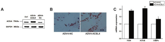 To further illustrate the function of ACSL4 in intramuscular adipogenesis and lipogenesis, we performed an adenovirus-mediated overexpression of ACSL4 and evaluated the lipid deposition and composition in pig intramuscular preadipocytes. Compared to the control, the transduction of the cells with Adeno-ACSL4 dramatically increased the ACSL4 protein expression and lipid deposition, as shown by the Western blot (Figure 4A and Figure S1) and Oil Red O staining (Figure 4B). We also observed significantly elevated adipogenic marker gene expression including FASN, ACACB, and C/EBPα (Figure 4C). Thus, it is concluded that ACSL4 is a positive regulator of intramuscular adipogenesis in pigs.