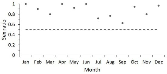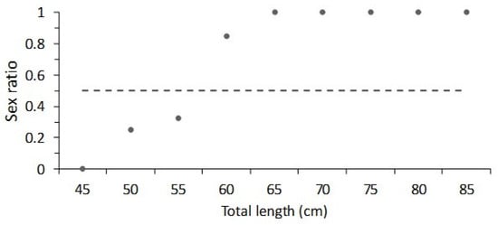 Sex ratio was calculated monthly. The sex ratios were compared using a chi-squared (X2) test, assuming that the sex ratio was 0.5. The null hypothesis was rejected if the X2 estimated value was greater than 3.84 (α < 0.05, df = 1) [24,25]. Additionally, the sex ratio was also represented for each 5 cm (TL) length class.