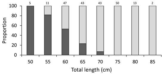Figure 3. Proportion at length of immature (dark gray bars) and mature (light gray bars) females of Narcine entemedor throughout the study period (n = 214). The sample size is denoted above each bar.