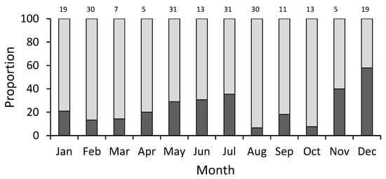 Figure 4. Monthly proportions of immature (dark gray bars) and mature (light gray bars) females of Narcine entemedor throughout the study period (n = 214). The sample size is denoted above each bar.